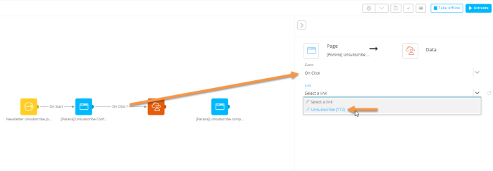 - From the Data Component to the "Unsubscribe Complete" page, select the 'On Success' event.