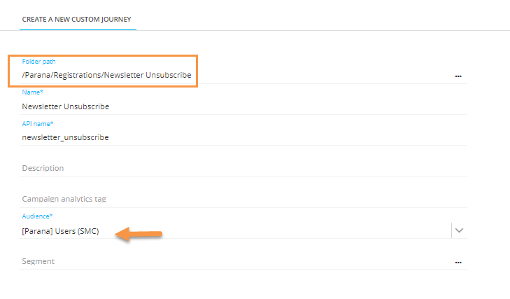 1. Select 'Journey' from the first-level navigation on the left and create a new Custom Journey "Newsletter unsubscribe" in a dedicated folder, here "Registrations". This is the folder where also the pages are stored.