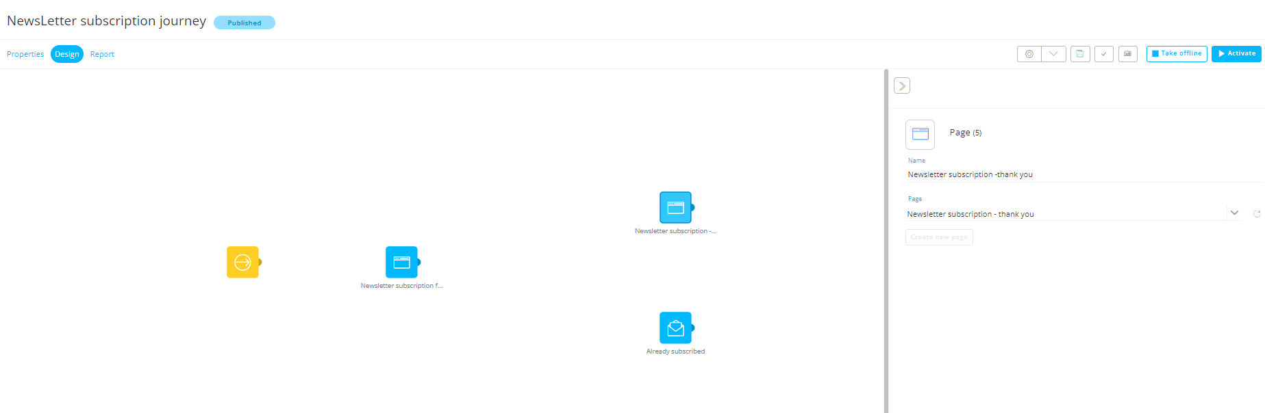 Save your journey and Publish. Publish is required to be generate the anonymous URL link allowing us to test the journey. The final journey should now look like this: