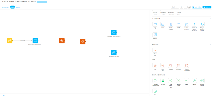 2. From the Components panel on the right, drag an Input Component, 2 Page Components (one for the 'Newsletter subscription form' and one for the 'Newsletter subscription - thank you'), and an Email Component (for the "'Already subscribed' email on the journey.) Select for each of the added components the corresponding assets.