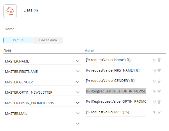 This function ensures that if the check box is ticked (value returned is 1), the value 99 is stored and if it is not ticked (no value is returned) the original value is kept. Store the value 99 for now, as the contact still needs to confirm the subscription. Only then, after confirmation you will update the NEWSLETTER_OPTIN/PROMOTIONS_OPTIN field with value 1. These values are of type text as the fields in the Audience List expect a text. If you use a numeric field in the Audience List to store the subscription, the following function should be used, without quotes around the values: