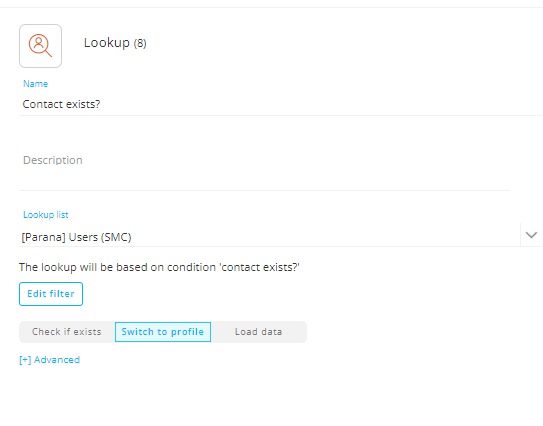 5. In the Lookup Component, check if the entered email address already exists in the database. Make sure the option 'switch to profile' is selected as you want to send the 'Already subscribed' email to the known contact: