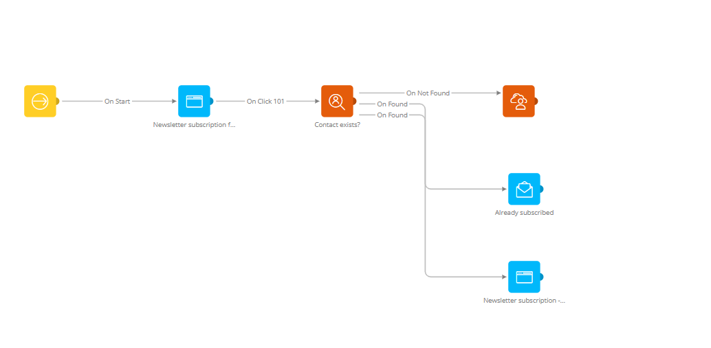 6. Next, drag a link from the Lookup component to the Data Component using the event, OnNotFound. You will only save the record if it does not exists yet. Drag the OnFound link to the 'Already subscribed' email and also to the 'Newsletter subscription - thank you' page. This is necessary because every path needs to end in a page.