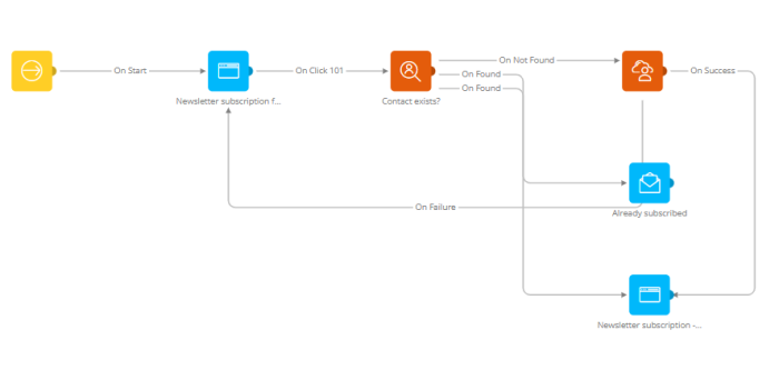 8. A Data Component has 2 events 'OnSuccess' and 'OnFailure'. Point the 'OnFailure' trigger back to the 'Subscribe form' in the journey. If saving the data fails, you want to present the form again and try once more. The 'OnSuccess' trigger can continue to the 'Newsletter subscription - thank you' page.