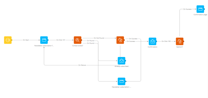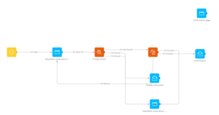 9. The contact still needs to confirm his subscription. Drag an Email Component for the 'Newsletter Subscription Confirmation' and a Page Component 'Newsletter subscription Confirmation' on the canvas. When everything is stored successfully you will send them the 'Newsletter subscription confirmation' email. Drag the Data component's 'OnSuccess' trigger to the 'Confirmation' email. The person filling out the survey must also see the result page.