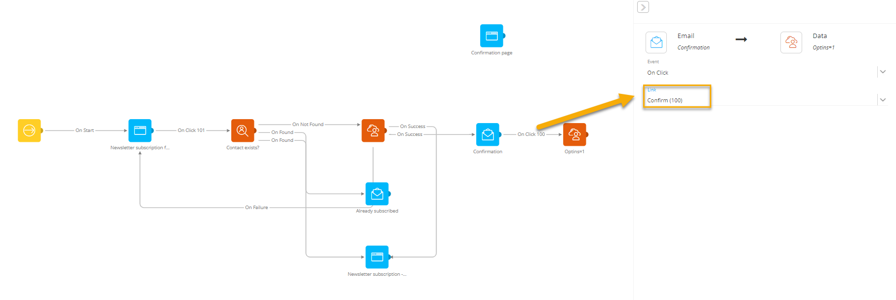 10. Finally, when the contacts clicks the 'Confirm' link in the 'Newsletter subscription Confirmation' email, you still have to update the opt-in values from 99 to 1. By using 99 earlier, you can identify which newsletter opt-ins they chose. Drag a Data Component on the canvas and link the Confirmation email 'Confirm' link to the Data Component.