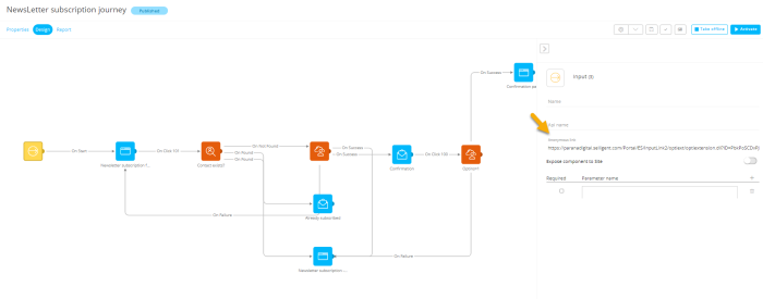 1. You can test the journey by going to the Input Component an double clicking the URL link. Note that in the screenshot below the OnSuccess trigger for the last Data Component points to the "Already subscribed" email as every path needs to end in a page. If you want, you can create a dedicated page for this specific event: 'Subscription successful'