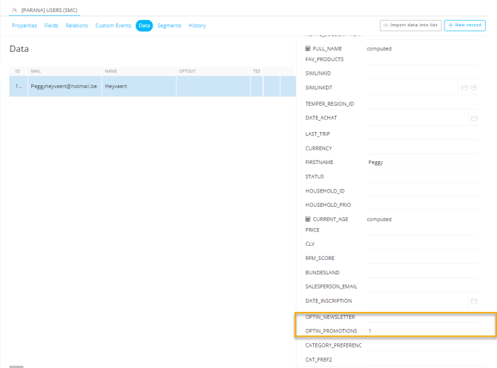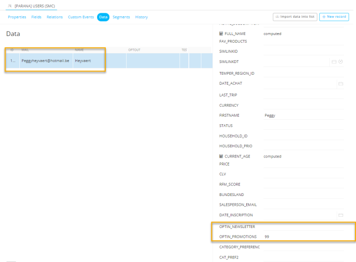 4. Before confirming, let's check the Audience List. There should be a record now for the entered contact, with a value 99 for the OPTIN_PROMOTIONS field and empty value for the OPTIN_NEWSLETTER field.