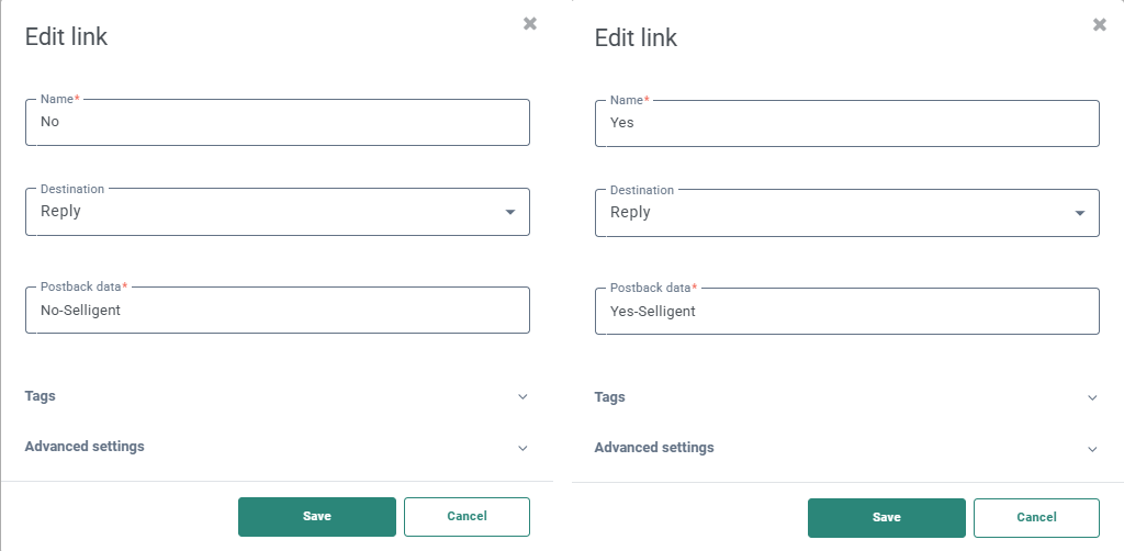Note: Ensure it is configured as a Reply, as we need the postback data to capture the keywords for the incoming RCS reply. More details on Reply links are available in this article.