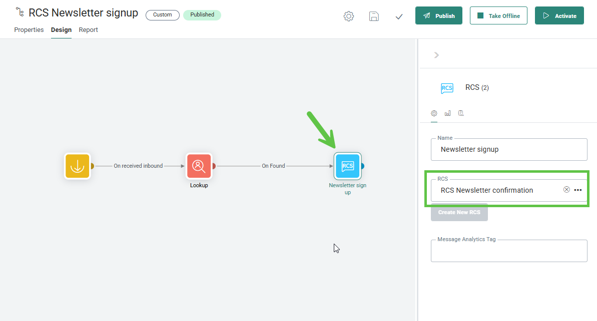 4. Last, add the RCS Message Component and select the RCS message created in step 2.