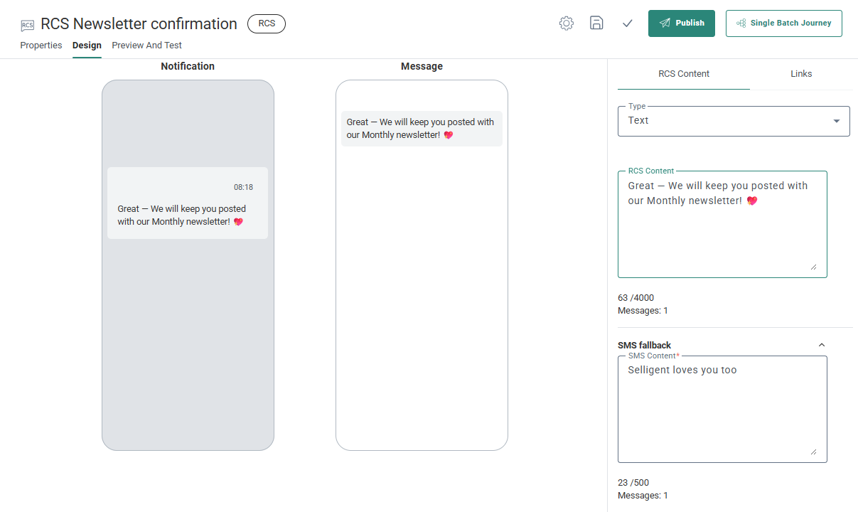 - Build a simple Journey to send the initial RCS message.