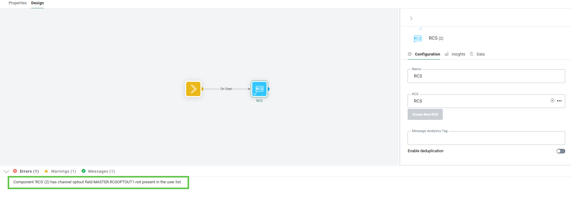 For example, when you add an SMS to a journey that uses an SMS channel endpoint, the system relies on the SMSOptout field to store the channel-specific opt-out information. During validation, the journey checks whether this SMSOptout field exists in the Audience List being used. If the field is missing, a validation error is displayed and the journey cannot be published.