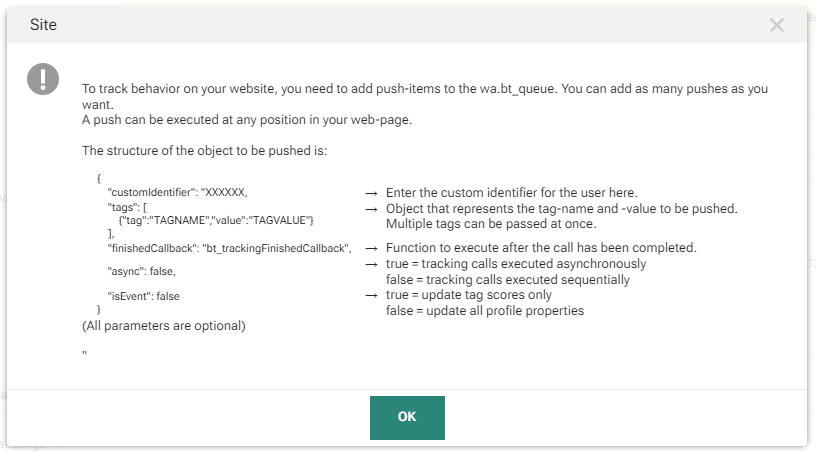 Note: The Site JavaScript-API documentation can be found here, including the standard script info, an API tracking calls overview, tracking and targeting info, info on how to disable behavioral tracking, and the usage of exposed fields.