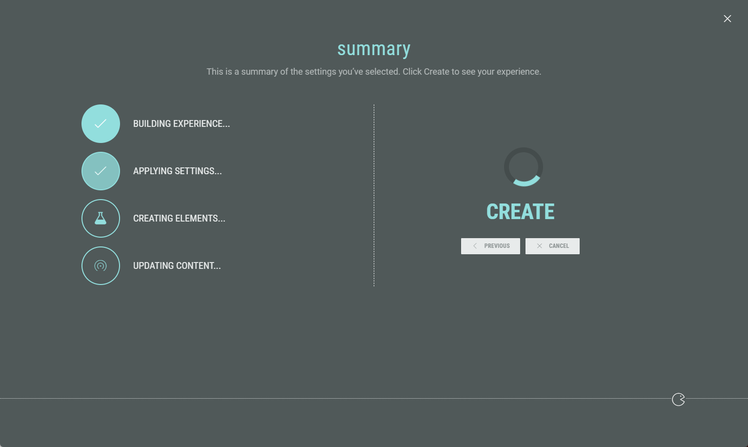 After clicking Create, you'll notice that the Experience is being created. A dynamic loading screen is shown, containing the steps done and the ones still to be completed on the left, and a spinner icon on the right:
