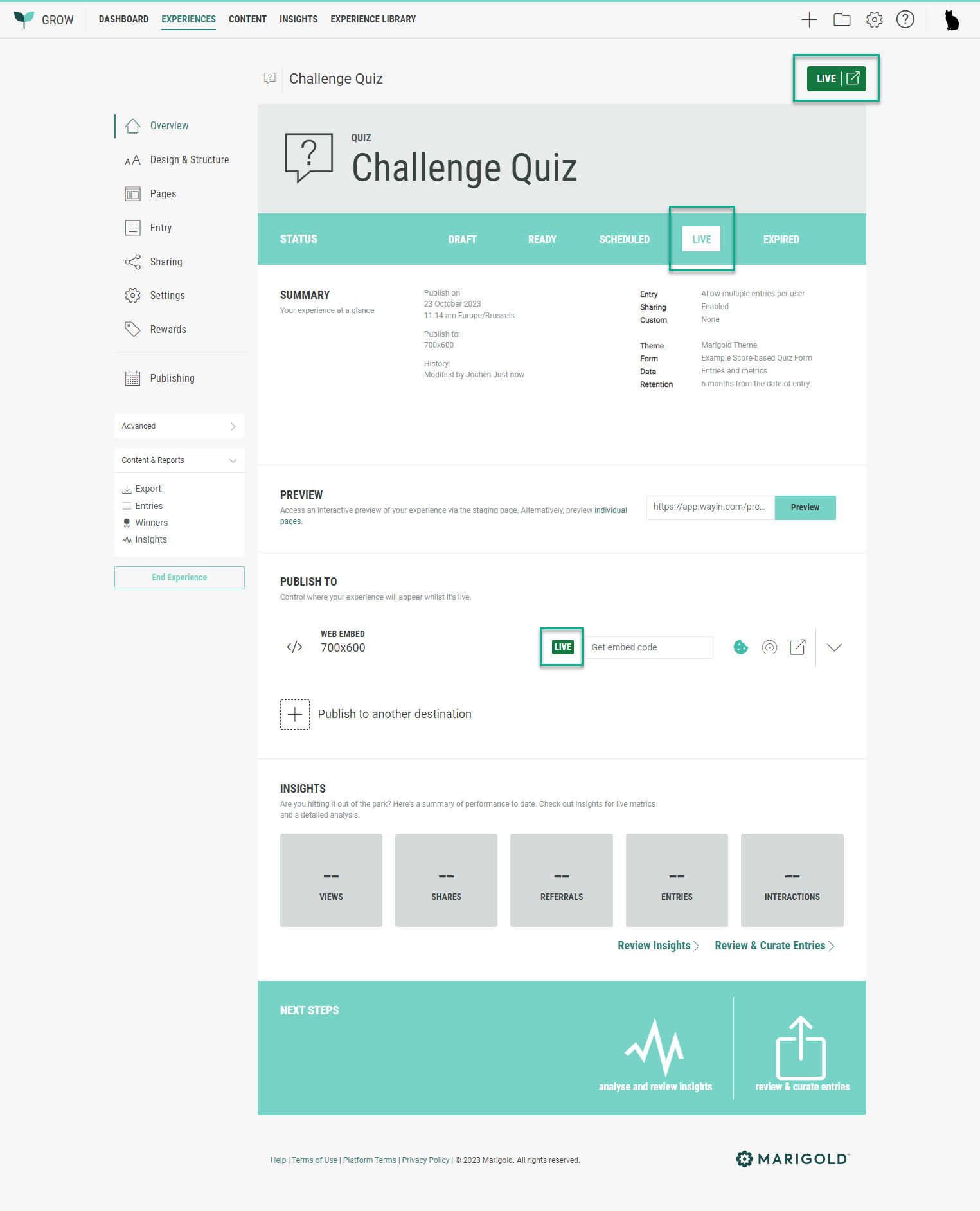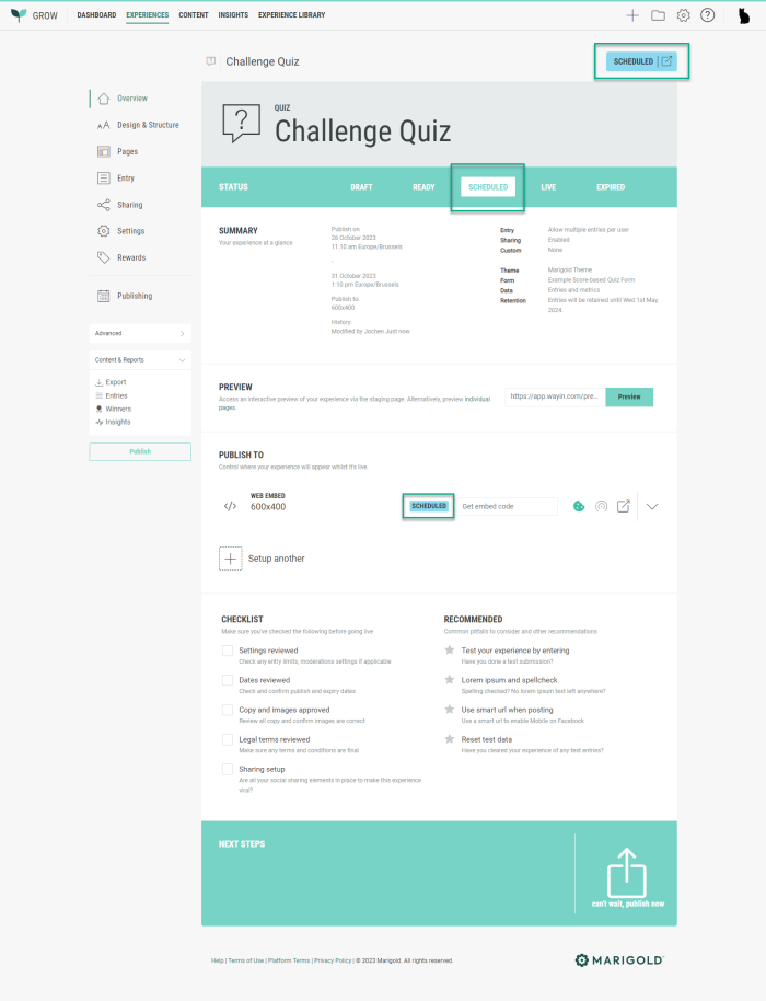 You will now see that your Experience is live/scheduled, with the settings you defined.