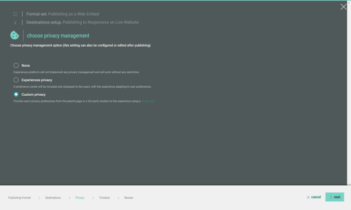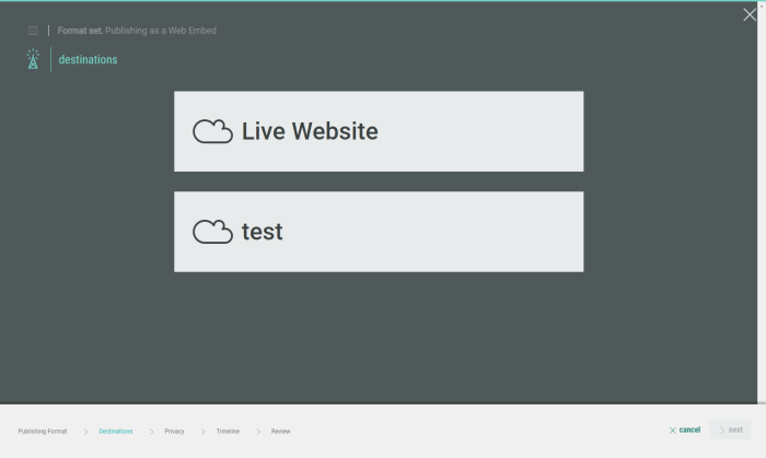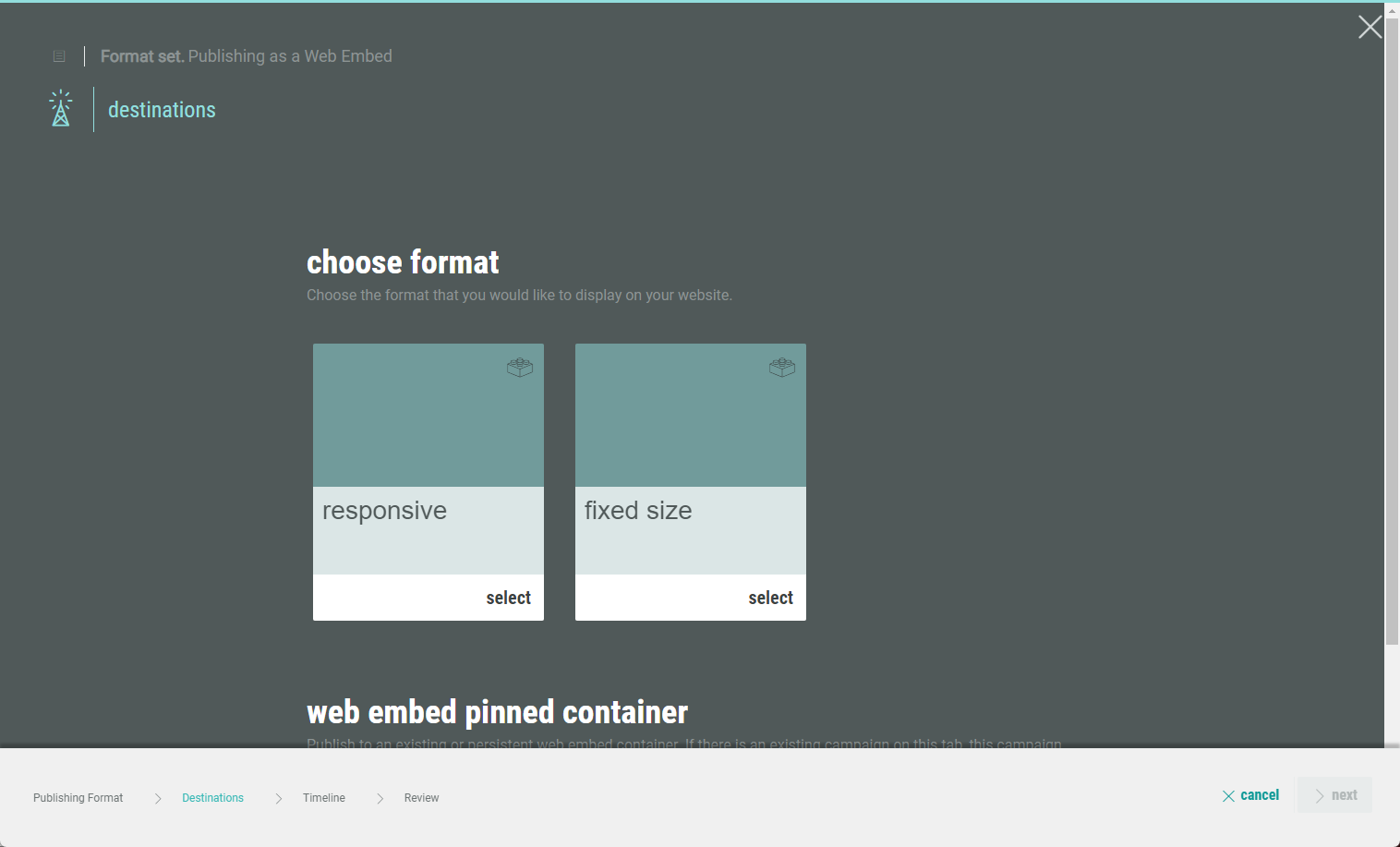 Depending on your format choice (embed or microsite), set the layout format and dimensions, and click Next.