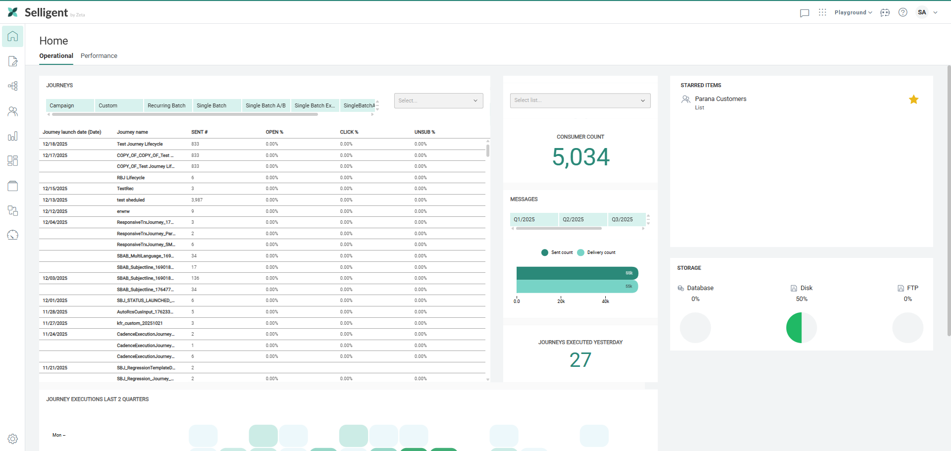 Home — The Home dashboard is accessible from the left navigation, providing marketers with valuable information on how their campaigns are doing and insights on messages, contacts, journeys (Operational tab).
