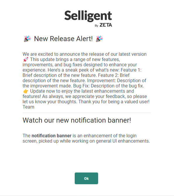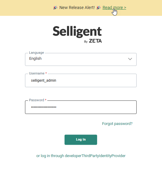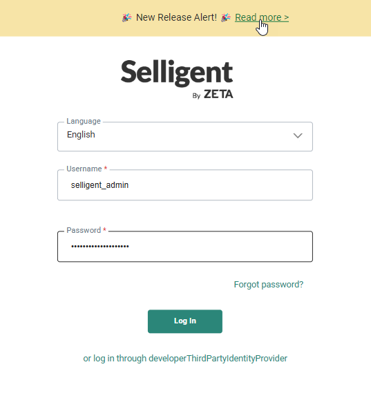 The login screen also shows important notifications (for example when a new Selligent by Zeta release is available).