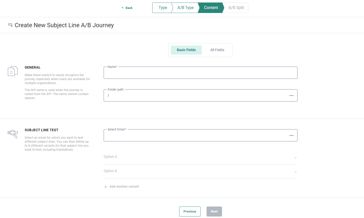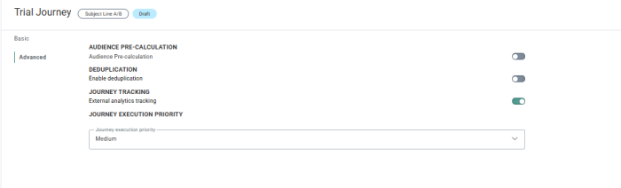 The Basic entry is used to set the general properties for the Subject Line A/B Journey.