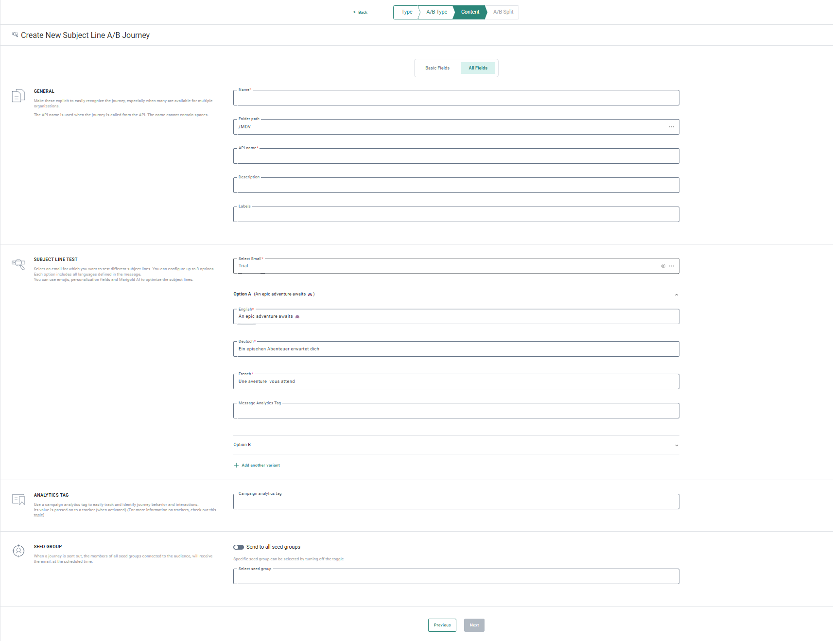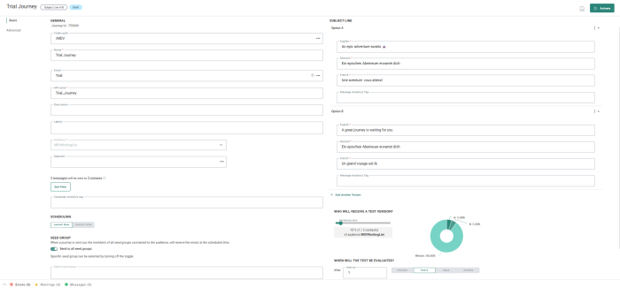 Additionally, a message analytics tag can be defined for each option. This allows individual tracking on this subject line in the journey reporting.