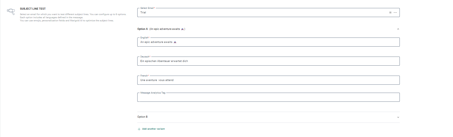 By default, each language field in Option A is pre-filled with the default subject line as set in the message.