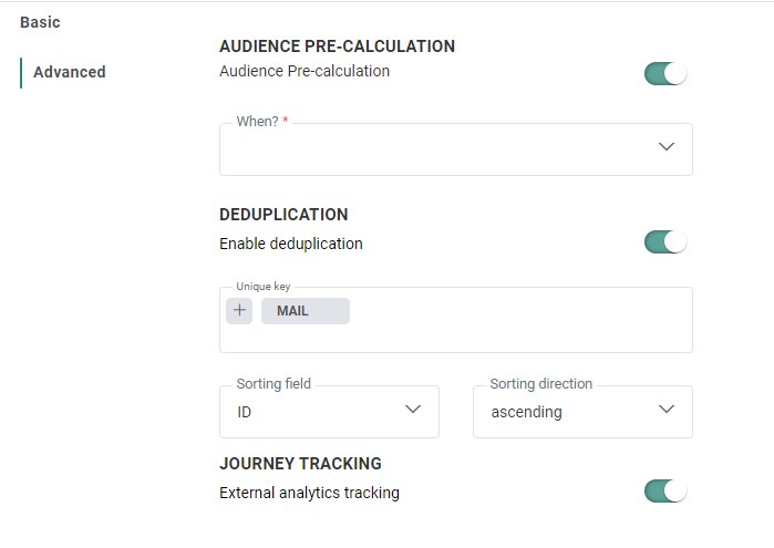 - Sorting field — Here you define what field in the audience should be used to define the record that has priority over the others in case duplicate records are found. For example, you can use the last update date as a prioritization rule.