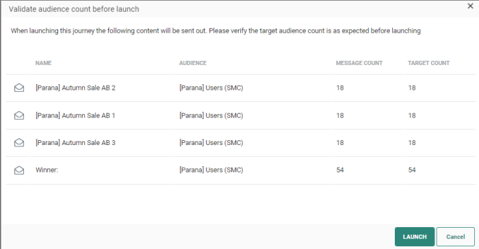 When launching the journey, you are informed about the content that will be sent, the audience and filter applied and the number of contacts that will be targeted. A dialog is displayed with this information. The counts displayed in the dialog reflect the deduplication settings defined for the journey.