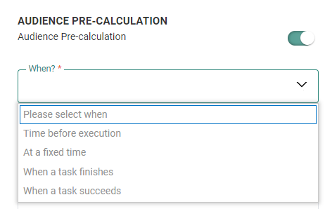 When — Only displayed when the audience pre-calculation is activated. You can choose from the following options: