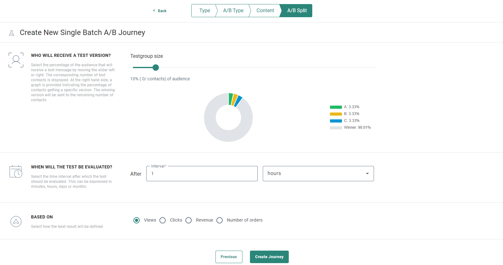 Single Batch A/B Journeys allow testing different versions (2 minimum, 7 maximum) of