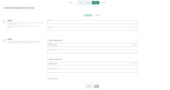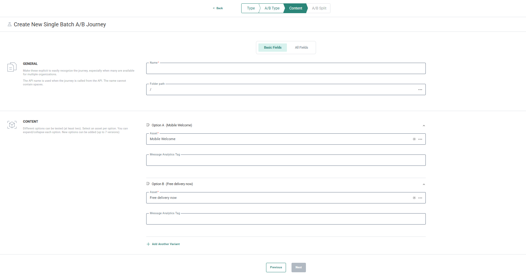 Repeat the same for the second message, by clicking the asset field under Option B and selecting a message from the asset selector. If more than two messages are required for your A/B test, click + Add Another Variant to add an additional one.