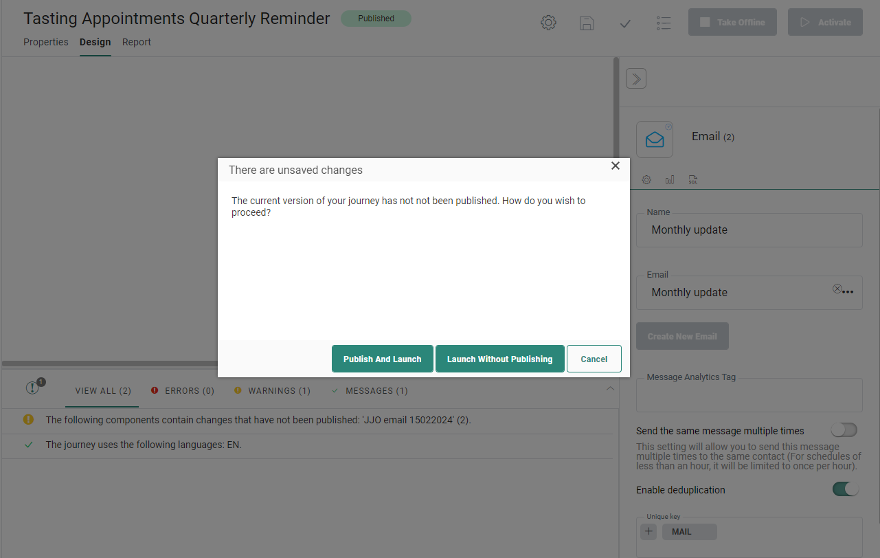 - Publish and launch — This publishes the current version, and launches the journey using the new published version