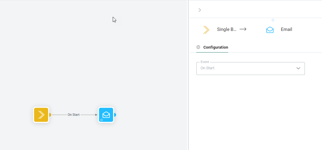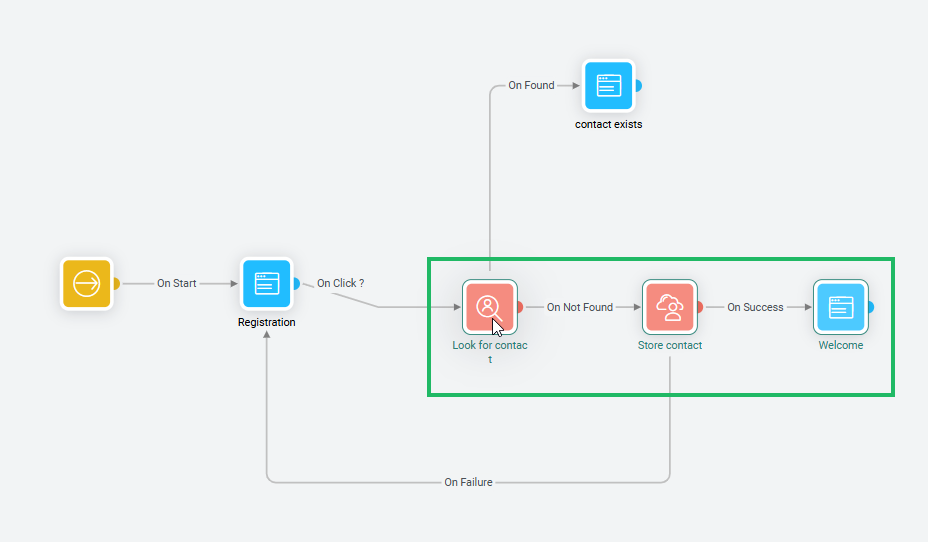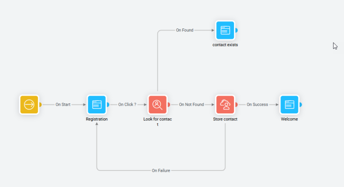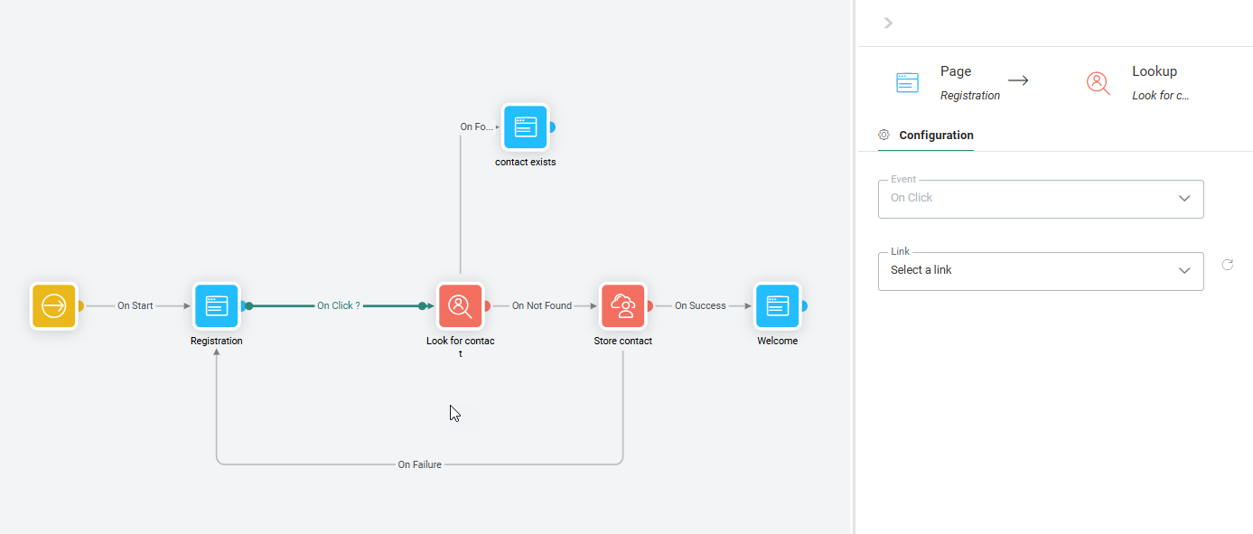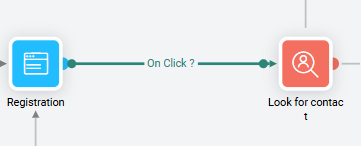 In addition, events are defined on these connectors to indicate when a contact will pass from one component to another. Examples of events include 'Click', 'Success' or 'Failed'. The type of event that is associated with the connector depends on the component starting the link.