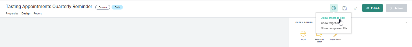 An Action menu gives access to the option Allow others to edit. This will unlock the journey and other users will be able to edit the journey straight away.