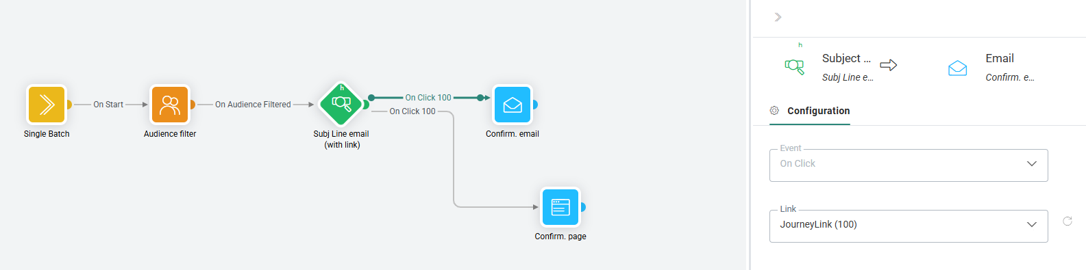 - When the email used within the Subject Line A/B Test Component properties, contains one or more links of type define in the journey, for each one of these links an outgoing On Click event must be set to any follow-up actions in the Custom Journey.