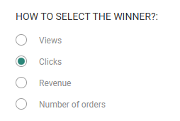 The total views, clicks, revenue, or order count per option is used to determine the winning version.