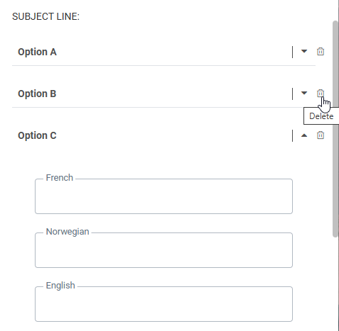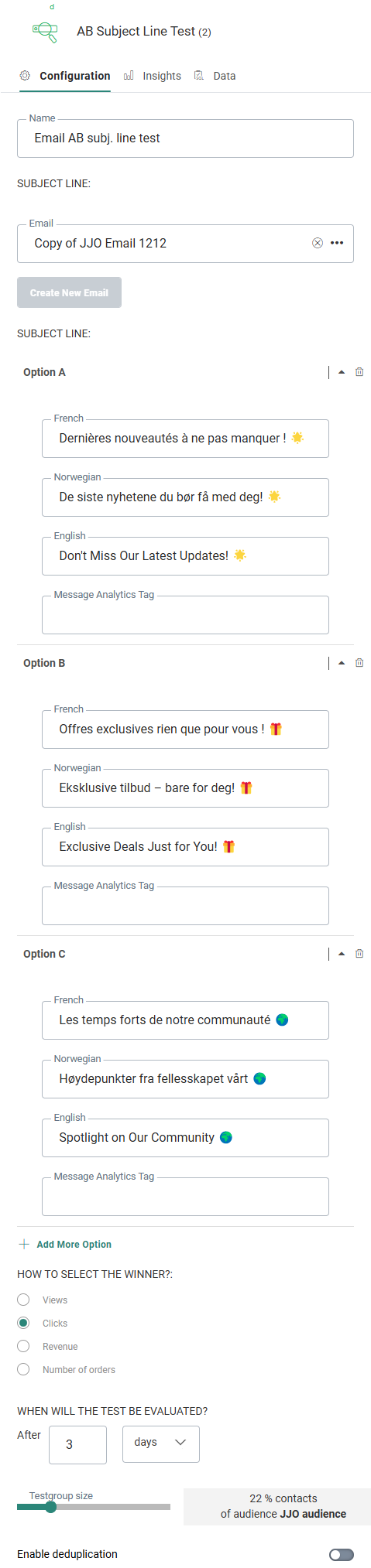 The Subject Line A/B Test Component allows you to test different subject lines in an email message (up to 7 versions), and in multiple languages (when available, depending on the languages defined in the email message).