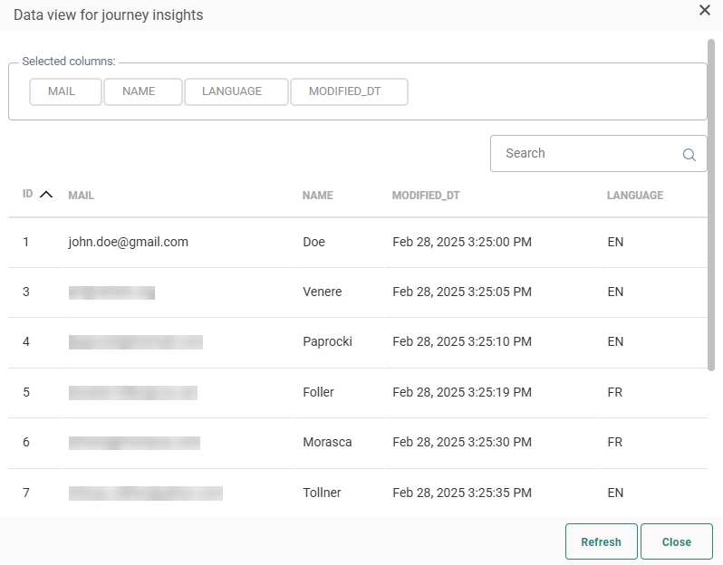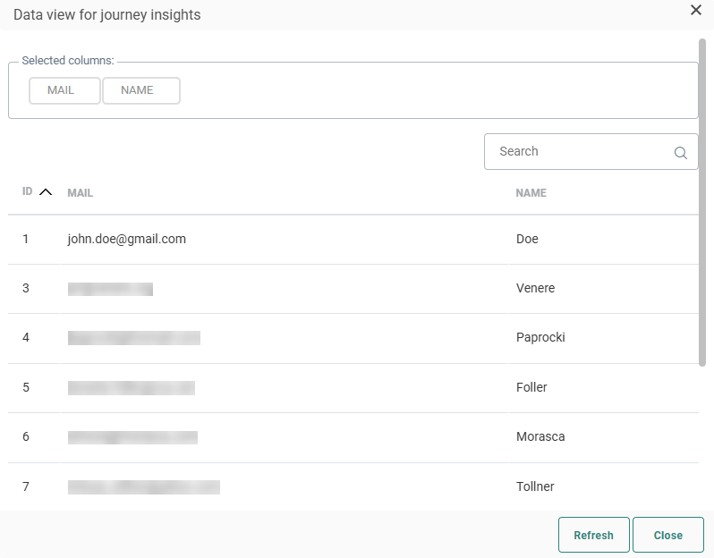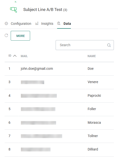 The Data tab provides an overview of all contacts in this step of the journey, with their name, email address and unique ID. You can search for a specific contact in the list using the Search field.