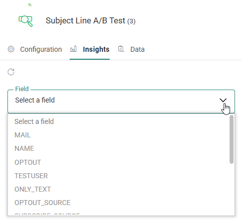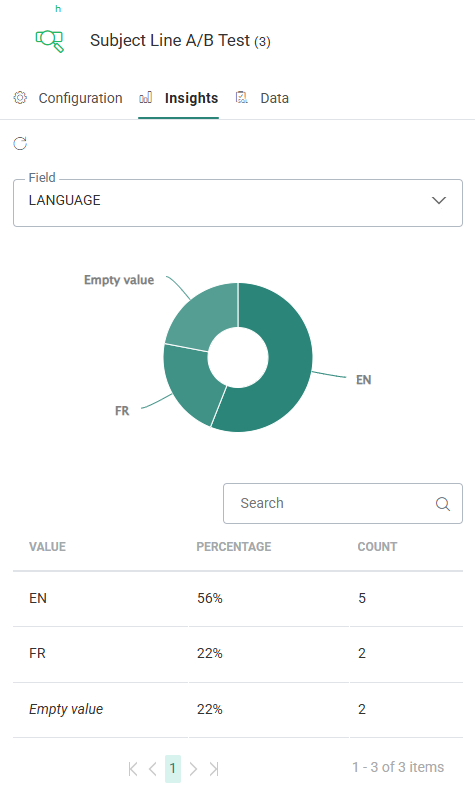 There are 3 tabs in the properties panel: the Configuration tab containing the component properties; the Data tab with the target contacts' data details; the Insights tab showing the distribution of the targeted audience.
