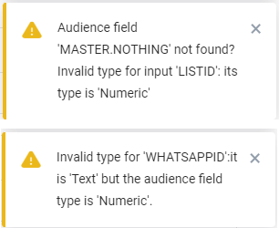 If the field is not found in the Audience List or if the length or type is not compatible, a warning will be displayed (one warning per issue).