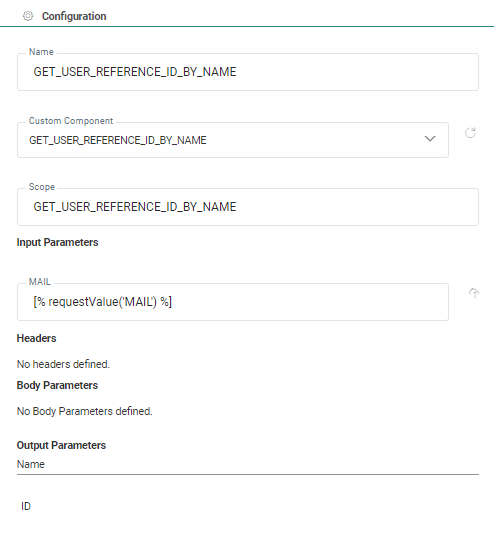The Custom Component is of type 'web service' and retrieves the ID and name for a given email. The value for the email is retrieved from a form. The ID and name are returned by the Custom Component.![]()