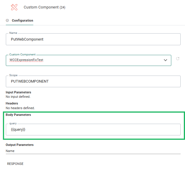 Output — The output section lists an overview of the output generated by the Custom Component. This output can be accessed by using the following expression: [%componentValue('Scope.Variable')%] where 'Variable' is the name of the output parameter.