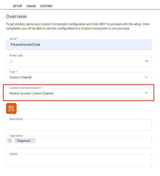The Custom Components are created and configured once in the Data Exchange entry (by a user having the required access rights). Then in the journey, you only select the one you want to use. This way of working splits the actual use and the technical configuration, making it easy to create a journey and still allow interaction with external channels.