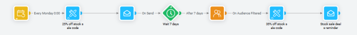 If they have not used the code after a week, they receive a newly generated 35% off stock sale code and an email is sent to them to notify about the new code.