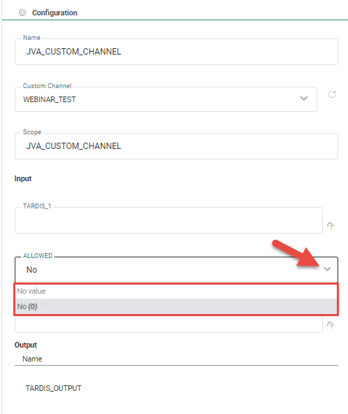 Custom channel — Select the custom channel from the drop-down list. Custom channels are created and configured in the Data Exchange entry and you can only select one here. Depending on the type of channel, the properties panel displays the extracted input and output parameters.
