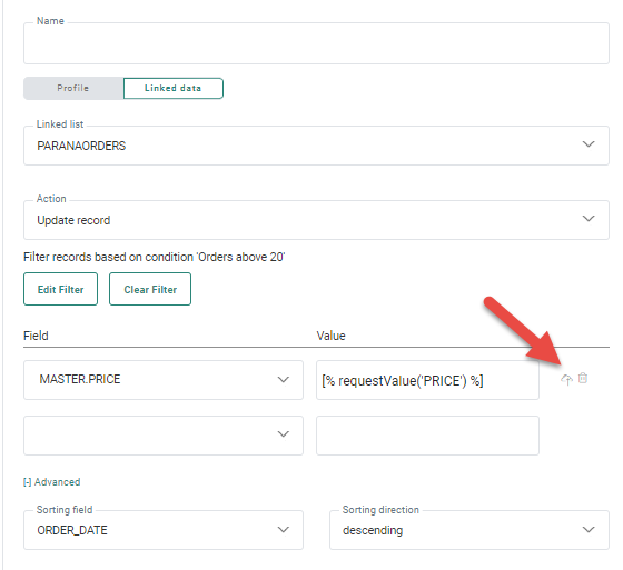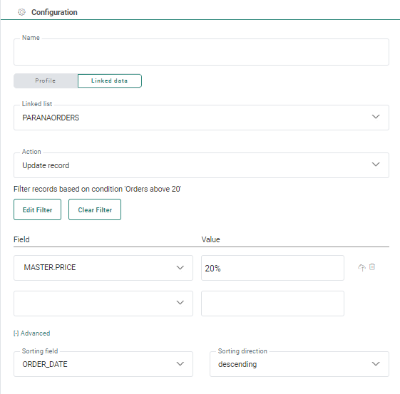 If multiple records are returned by the filter, the first one found will be updated. Records can be sorted ascending or descending. To do this, expand the Advanced section and select the sorting field and sorting direction.