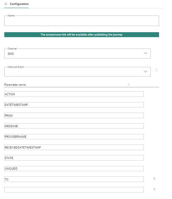 Inbound Event — Select an event from the drop-down list. These events are defined in the Data Exchange entry and can be only used once in a published journey. The selected event contains the keywords to look for. All greyed out events are already active in another journey and cannot be used twice.