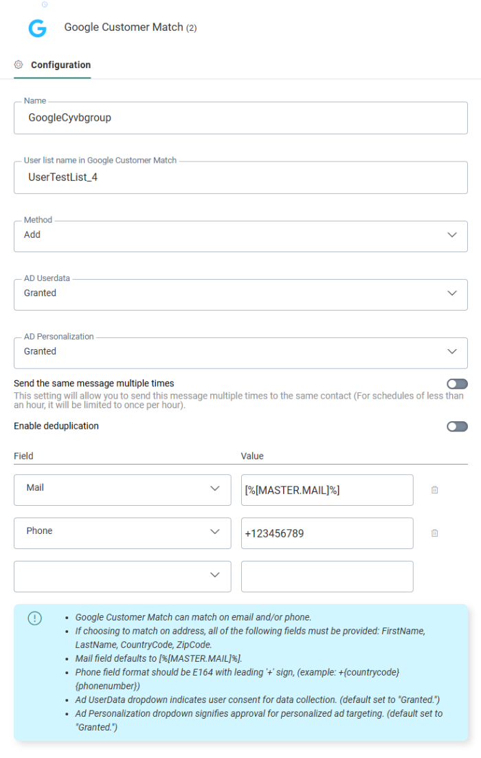 User list name in Google Customer Match — This is the name of the user list in Google. If the list does not yet exist, it will be created.