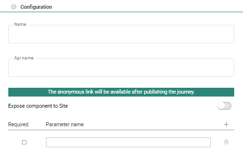 Enter the parameter name and tick the Required check box if the parameter value is mandatory (This option is only taken into account by the API, it is not used when called in a browser). Use the + button to add additional parameters. The values passed to the Input Component in the journey can be retrieved on the first page following this Entry Component.