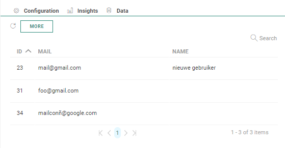 The Data tab provides an overview of all contacts in this step of the journey, with their name, email and unique ID. You can search for a specific contact in the list using the Search field.