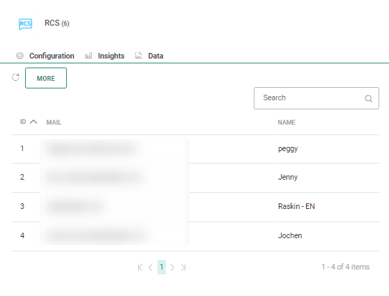 The Data tab provides an overview of all contacts in this step of the journey, with their name, email and unique ID. You can search for a specific contact in the list using the Search field.
